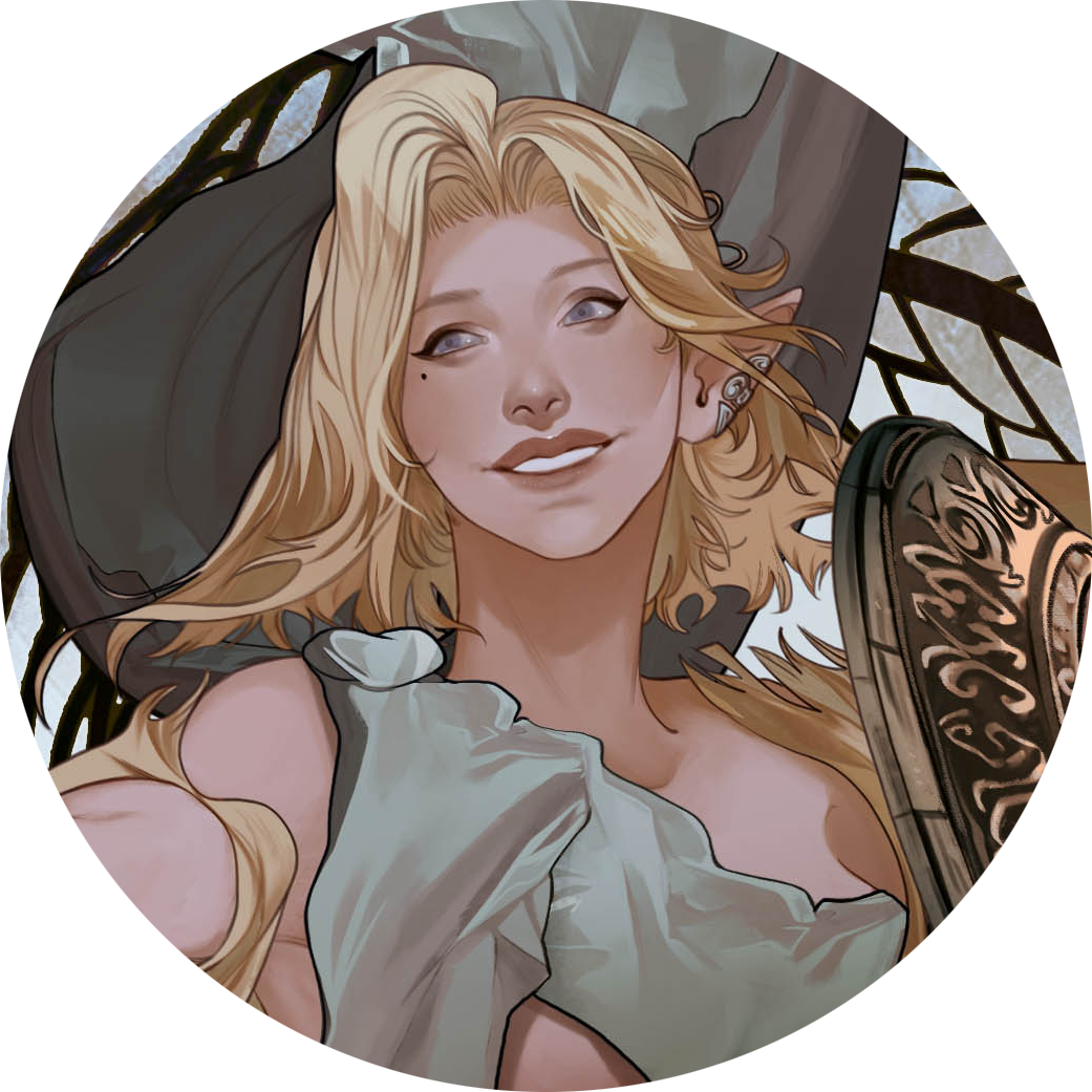 There stands Solaine by the table-head, pale and ceramic as a vase of lilies. When addressed, she replies coolly in a contralto voice; conversations and exchanges reveal that she is learned—perhaps considerably so—and polite, if not a little frosty. A crisp, tidy bob of gold hair hangs above her shoulders, framing tapered ears and an angular face. She is tall, straight-backed, an obelisk whether armorclad or draped in a penitent's black. Her red mouth forms a thin smile that just barely reaches her eyes.Those eyes. They are sleek, shaded, and thickly lashed; at every angle or glance, they seem distinctly feminine. But they pierce when they look, with a sharpness that lingers. Their hue is memorable: a hard, crystalline blue. These are striking eyes, unsettling ones. They are eyes that scrutinize everything.
