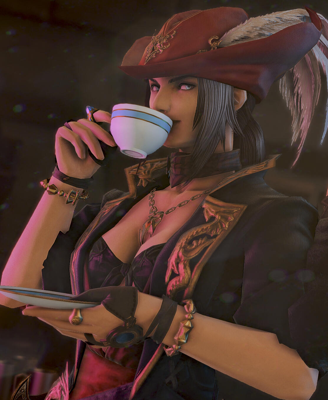 A COMMONALITY: Following introductions at the hands of Lord de Guiscareaux, Solaine marked a new interest in "FALLON," an Ala Mhigan traveler with a scarlet sense of style. Further encounters proved amicable; though from different parts of the realm, the two are considerably devout to their respective patron gods, and share an enthusiasm for the thrill of adventure. It is notably difficult—either by circumstance or by Durremont's own disaffective nature—for the lancer to make friends, much less see the potential in friends yet to be made. But there is simply something about Miss Rivensail that keeps the lancer curious, and coming around for another cup of coffee.